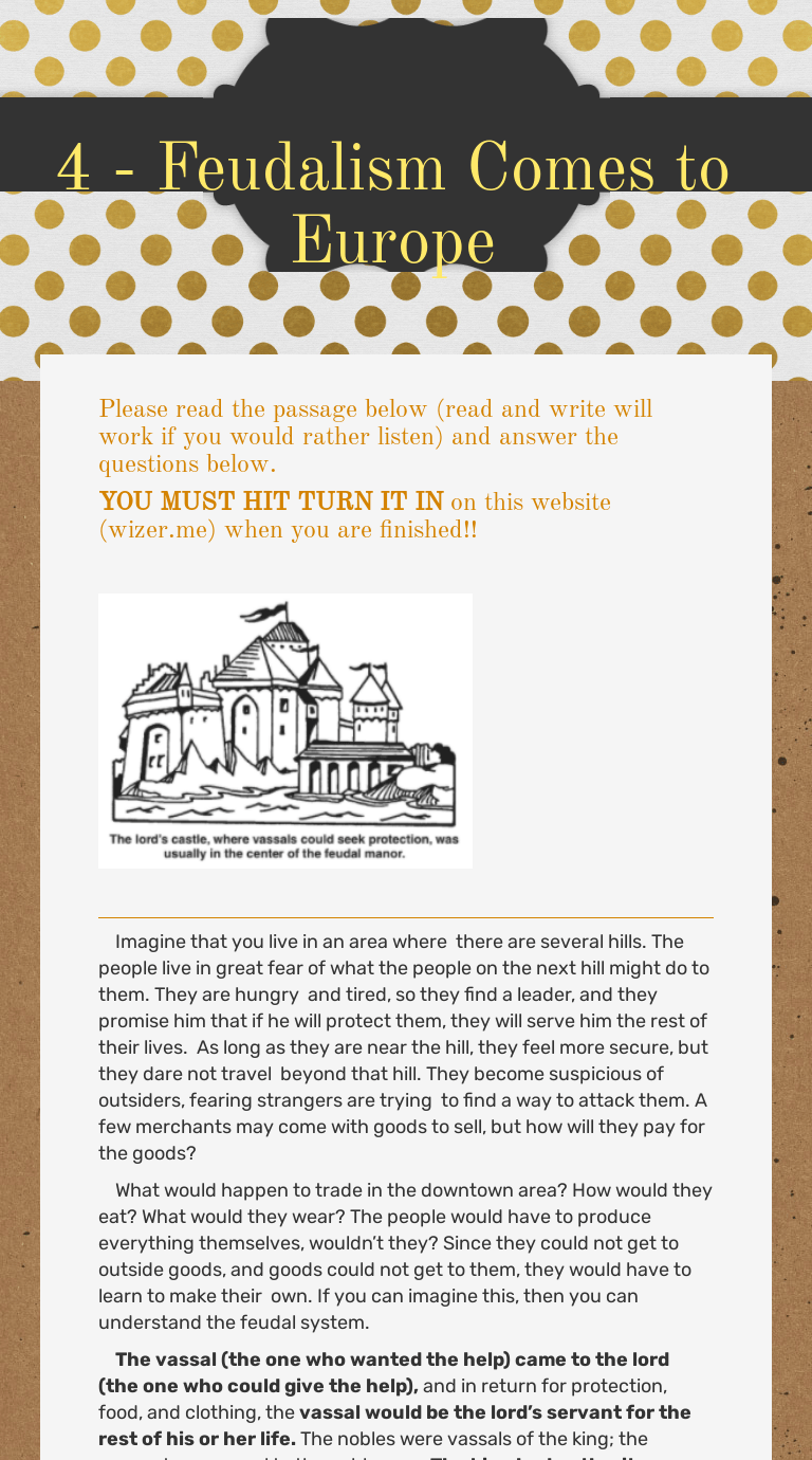 4 Feudalism Comes To Europe Interactive Worksheet By Marina Wallace Wizer Me from dynamic.wizer.me Feudal system online worksheet for 5º. English language arts, grade 4: An agricultural laborer bound under the feudal system to work on his lord's estate. Browse feudal system resources on teachers pay teachers, a marketplace trusted by millions of teachers for original educational . A system of feudalism developed to set up more rules and order. Practice problems online test and history questions for students. Funding for the captioned media program is provided by the u.s. . Feudalism information highlighting (lesson 4) and spice chart.